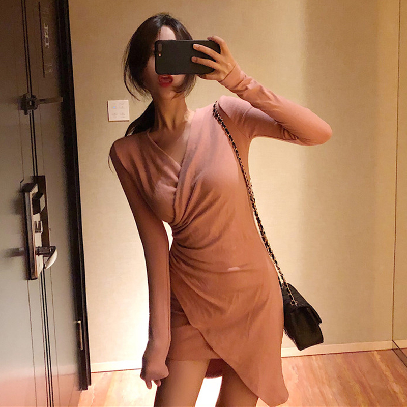 / 小黑裙子女秋裝2018新款小心機V領不規則包臀短裙修身長袖連衣裙