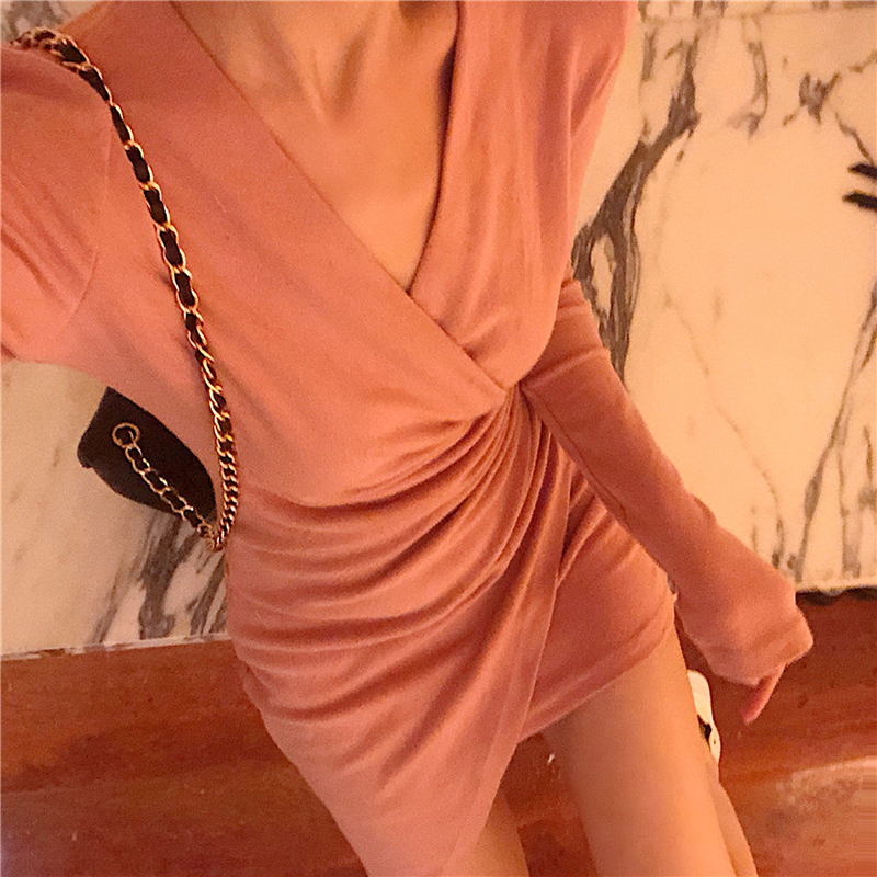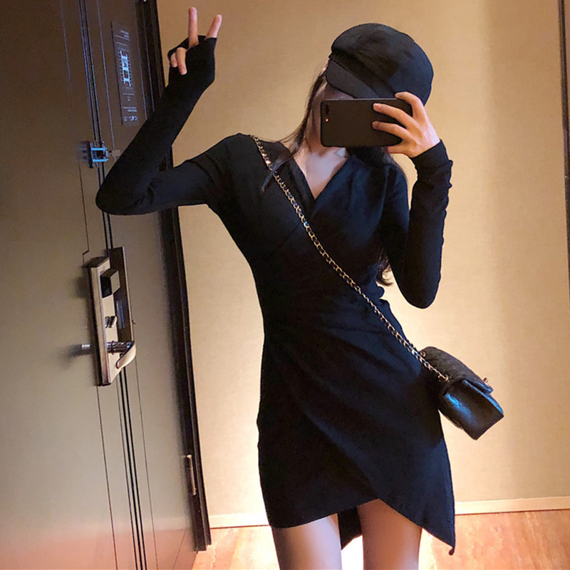 小黑裙子女秋裝2018新款小心機V領不規則包臀短裙修身長袖連衣裙