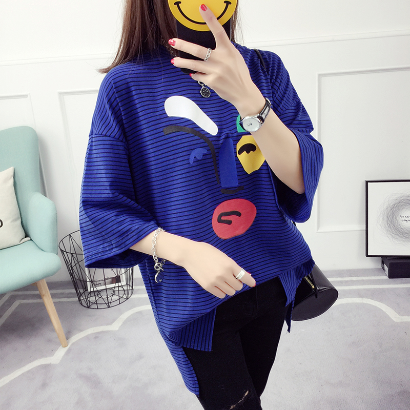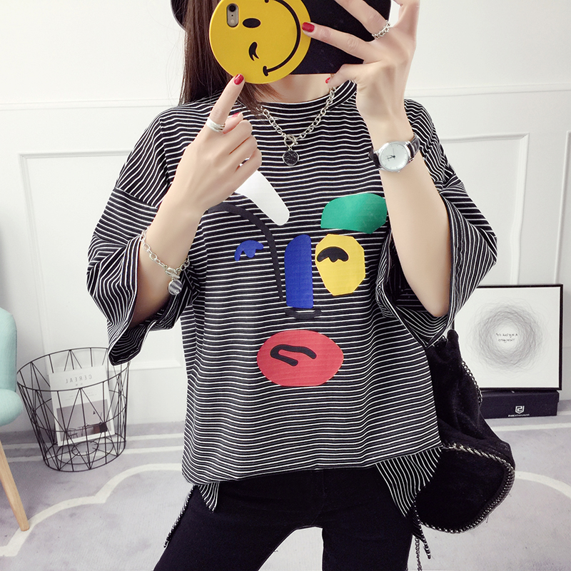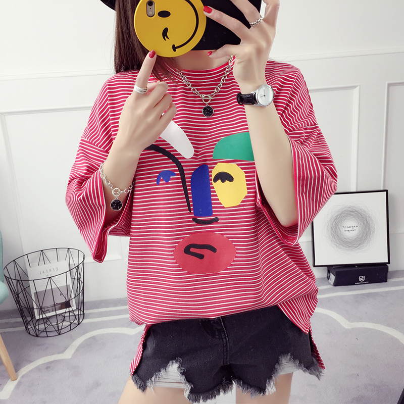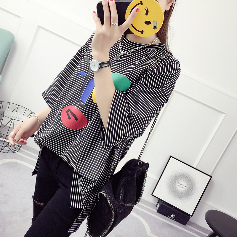 / 條紋t恤衣服女夏季春裝新款潮學生韓版寬松中長款打底衫短袖