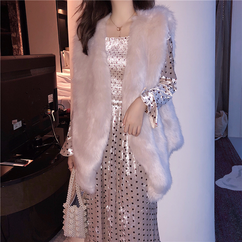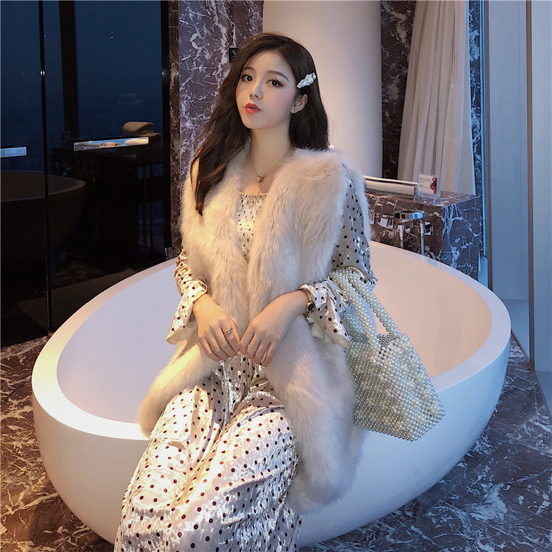 / 女神套裝秋新款溫暖毛毛馬甲皮草外套+絲絨波點印花連衣裙兩件套