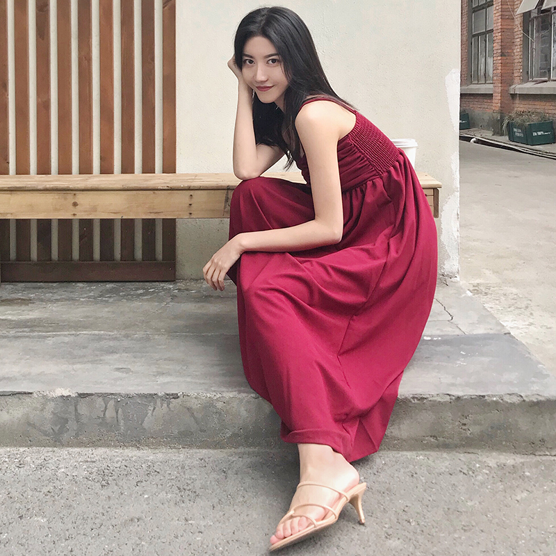 / 夏季新款女裝多肩帶收腰顯瘦抽褶抹胸純裙子色學生吊帶連衣裙長裙