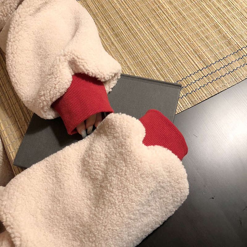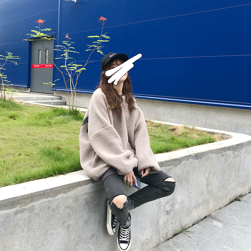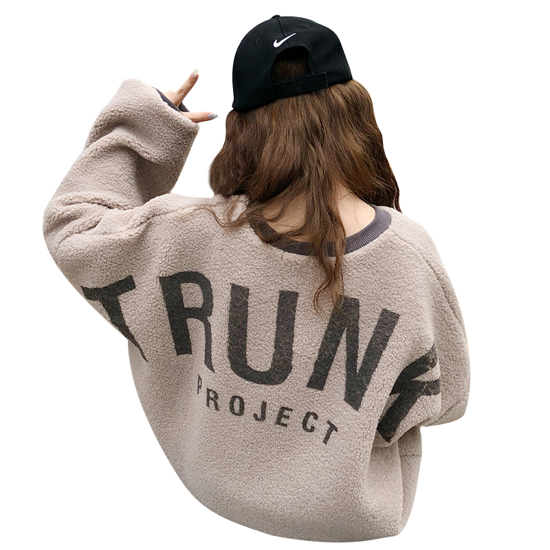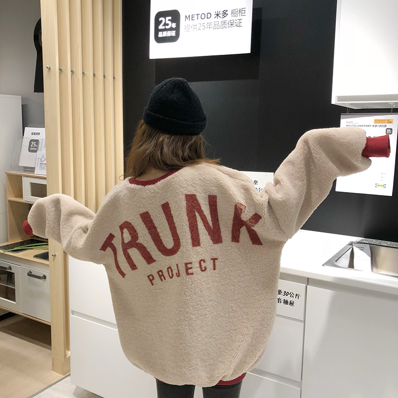 2018新款秋冬女裝韓版中長款寬松原宿風字母仿羊羔毛衛衣上衣外套