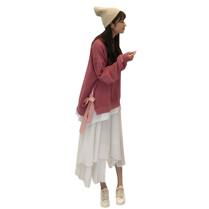/ 韓版時尚休閑套裝秋季女裝拼接開叉衛衣外套+不規則半身裙兩件套