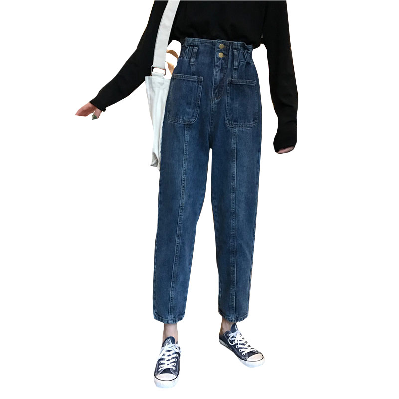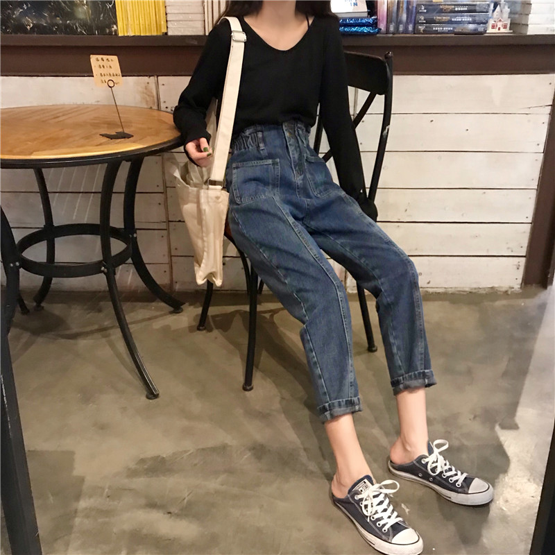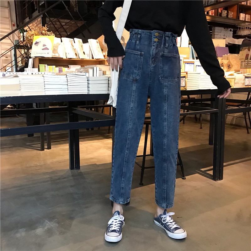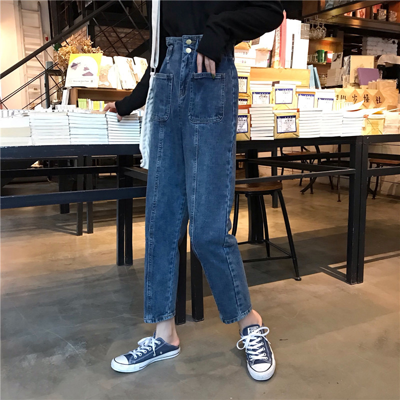 / 秋季女裝韓版花苞高腰牛仔褲寬松高腰直筒褲闊腿褲九分褲學生褲子