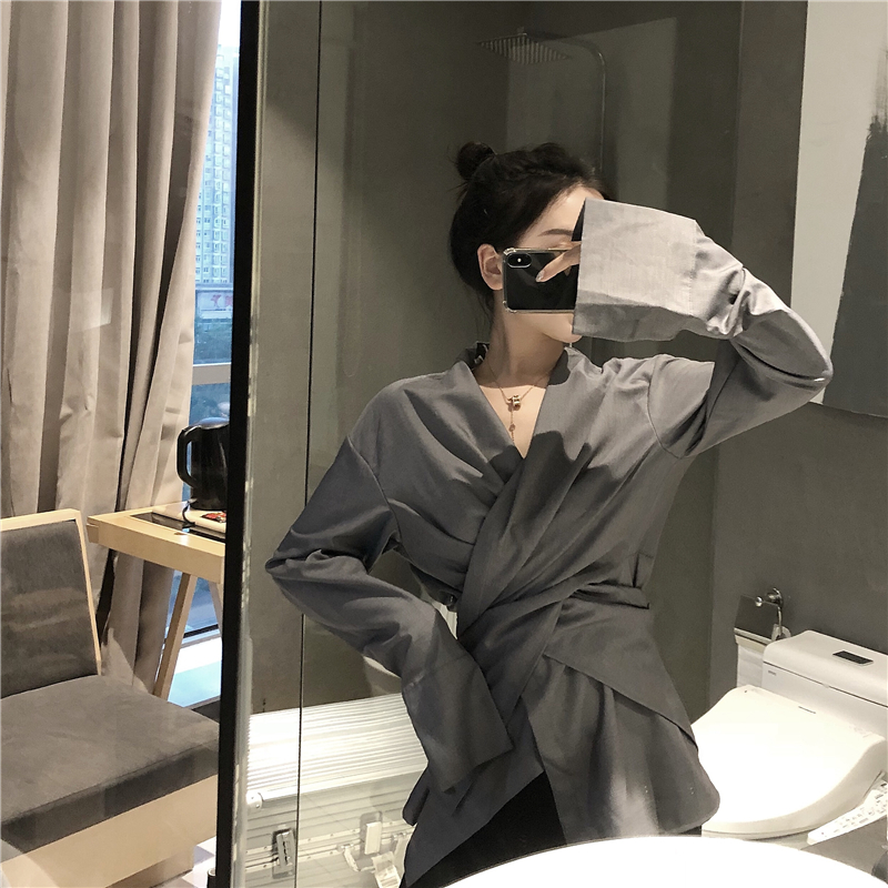 chic早秋上衣慵懶時尚秋裝女2018新款收腰系帶顯瘦喇叭袖上衣T恤