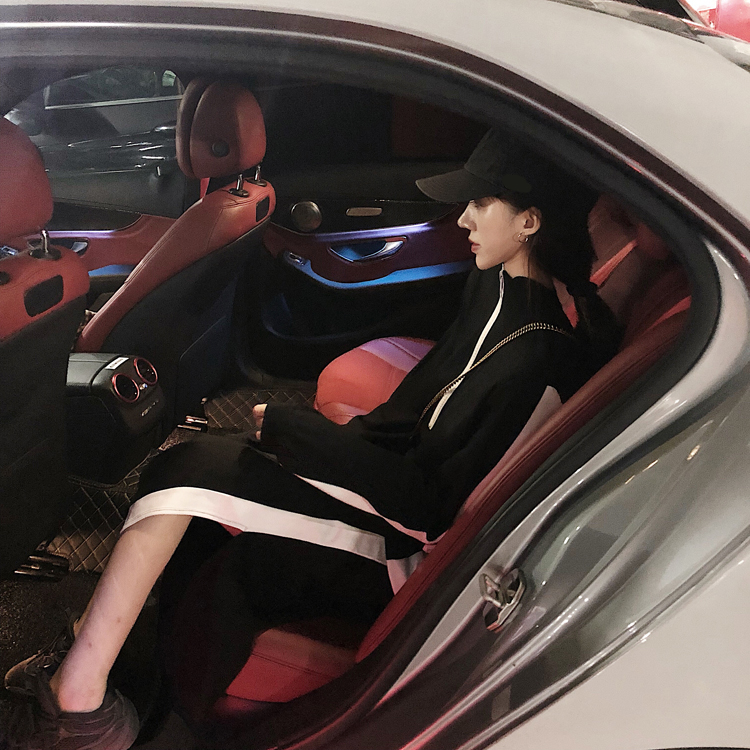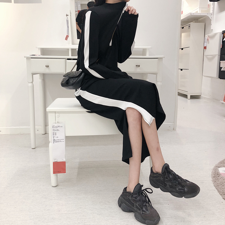 / 港風時尚女秋裝2018新款裙子黑白拼色長款休閑裙立領設計款連衣裙