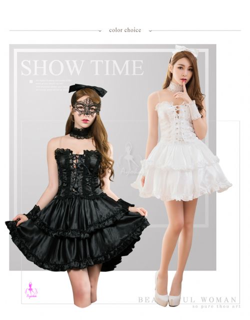 。規格尺寸: ◆ 內容物:馬甲式上衣x1+短裙x1+蝴蝶結髮箍x1+頸圈x1+手圈x2+貼心小禮-透明肩帶一組