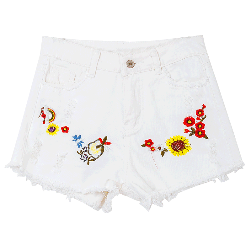 / 夏季新款女裝韓版花朵刺繡高腰白色牛仔短褲學生熱褲女顯瘦潮