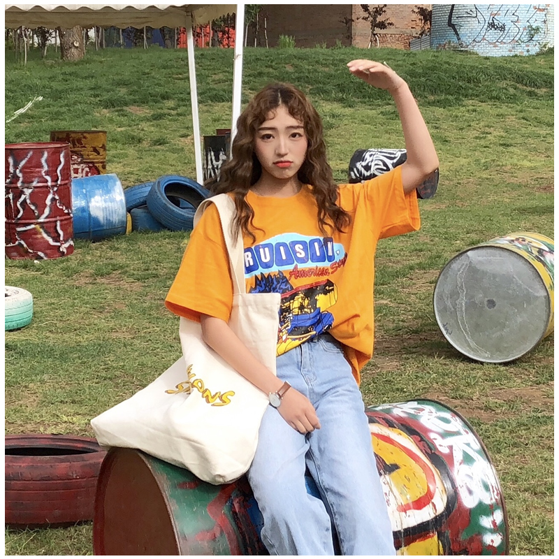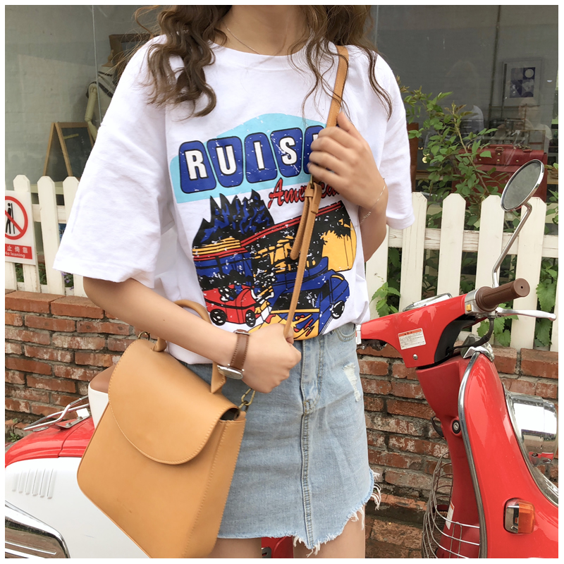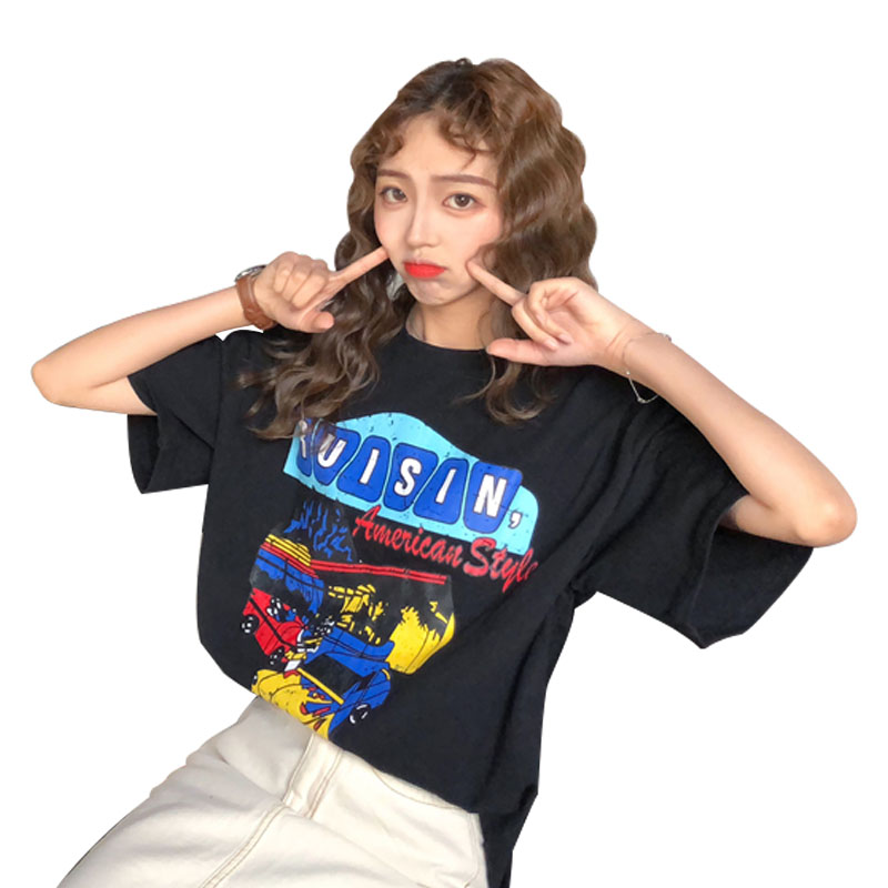 / 夏裝女裝韓版寬松原宿風字母卡通印花短袖T恤學生休閑顯瘦上衣潮