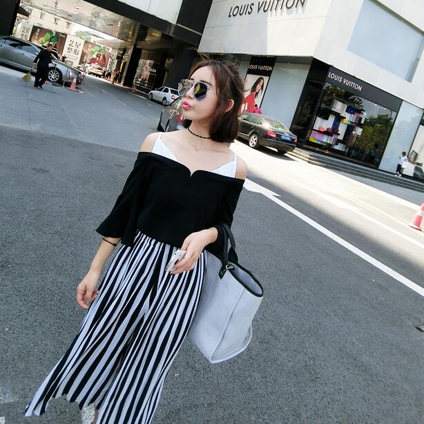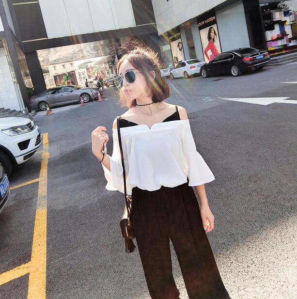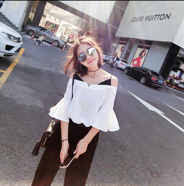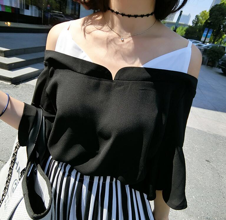 2017春夏女裝新款吊帶假兩件荷葉袖雪紡衫斗篷一字領露肩短袖上衣
