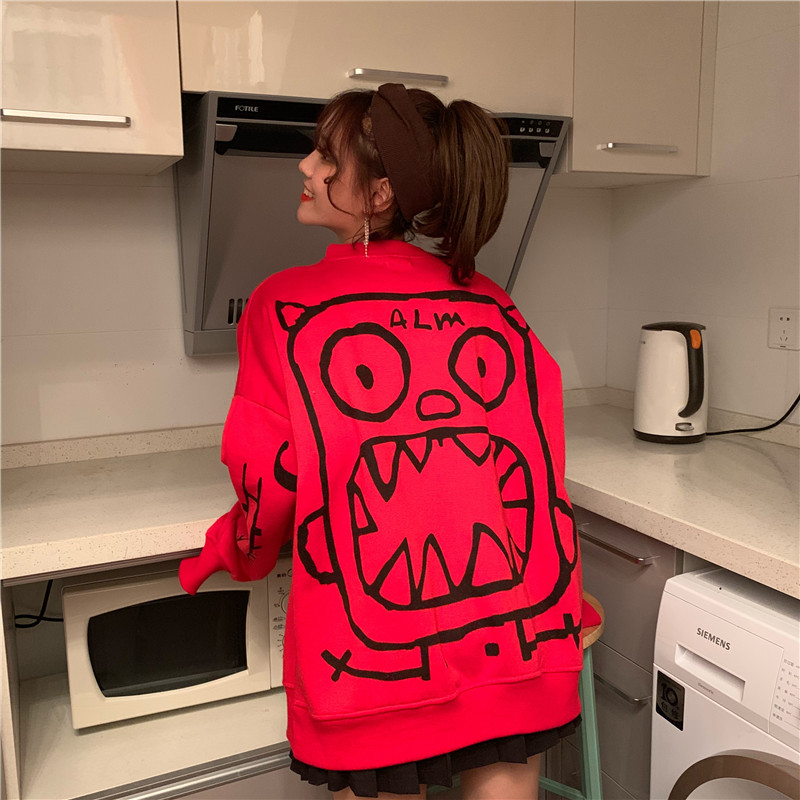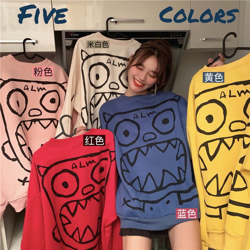 chic上衣慵懶風寬松衛衣女秋冬2018新款百搭涂鴉小怪獸加絨衛衣潮