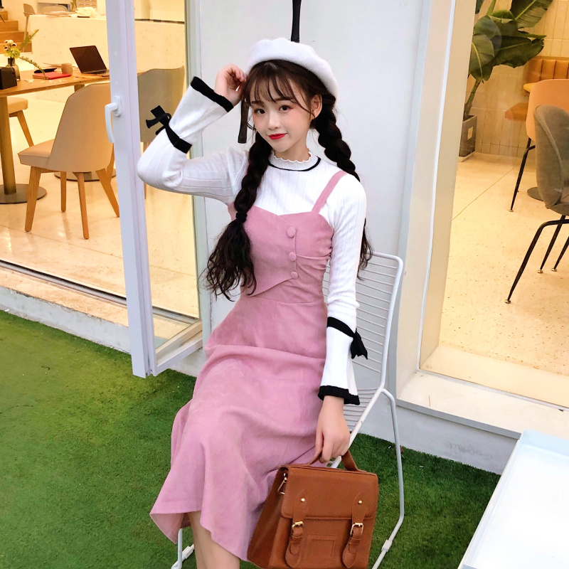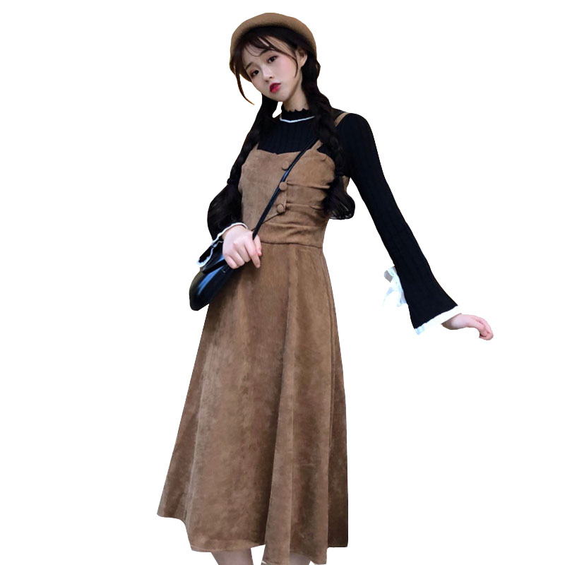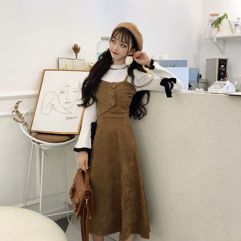 / 韓版時尚休閑套裝秋季女裝燈芯絨高腰背帶連衣裙+針織毛衣兩件套