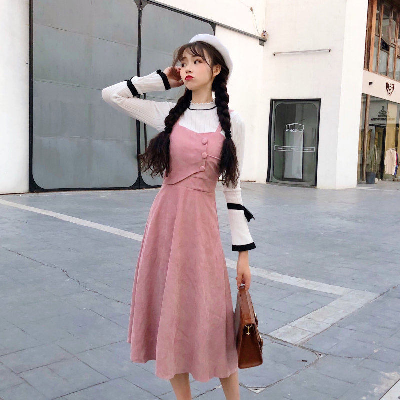卡色背帶裙(單件)|粉色背帶裙(單件)|白色毛衣(單件)|黑色毛衣(單件)