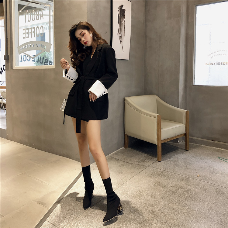 / 小香風2018韓版時尚chic秋季新款氣質拼色系帶顯瘦純色西服領外套