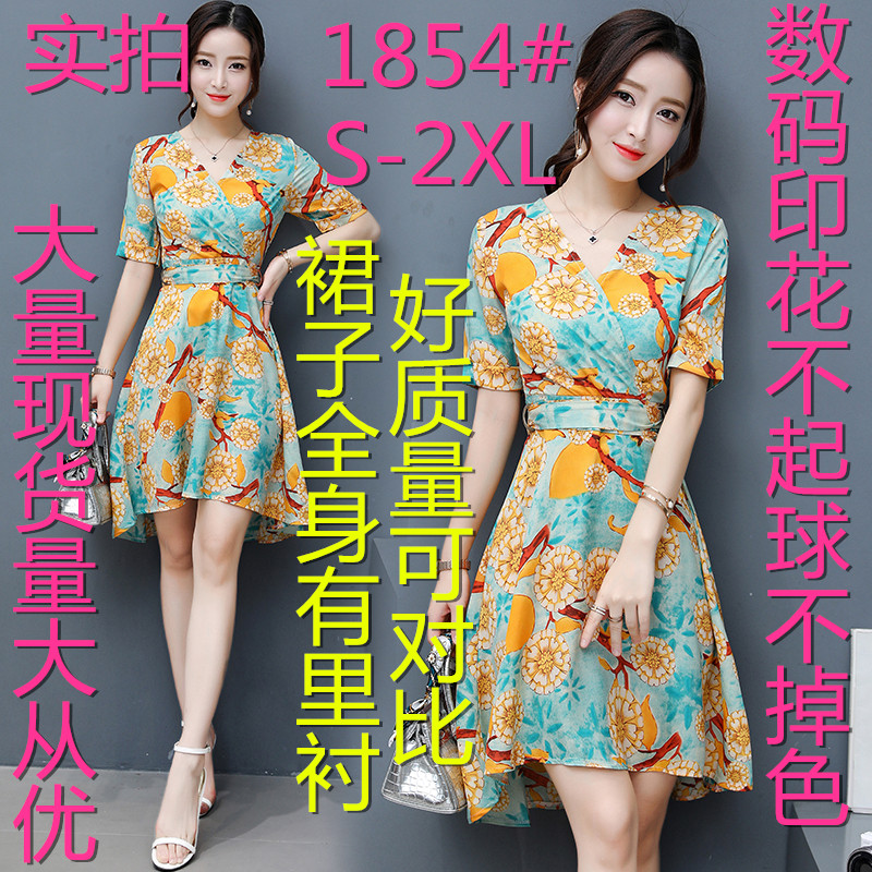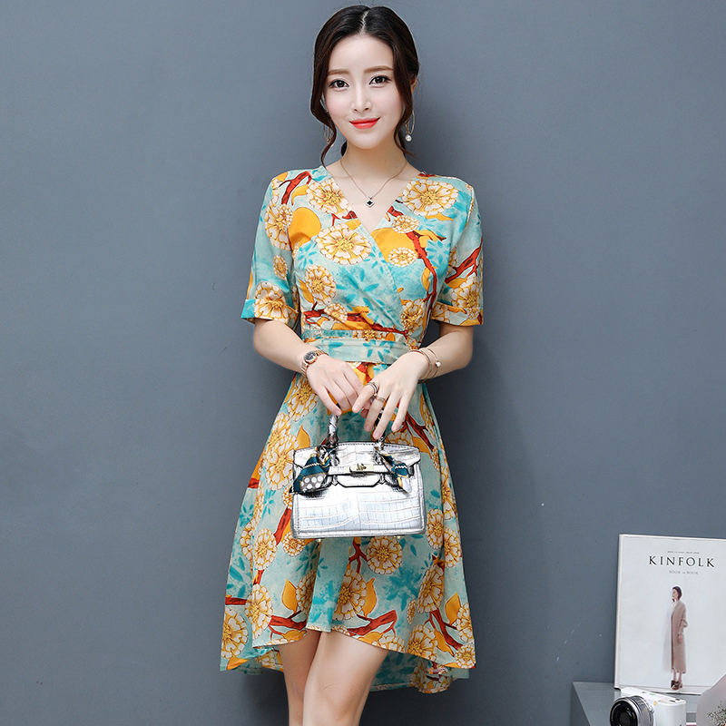 夏季新款女裝韓版氣質短袖修身裙子中長款印花雪紡連衣裙女潮