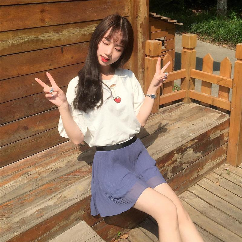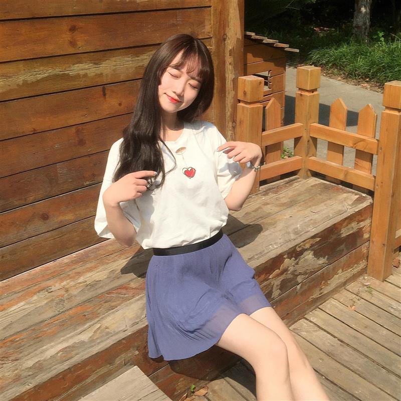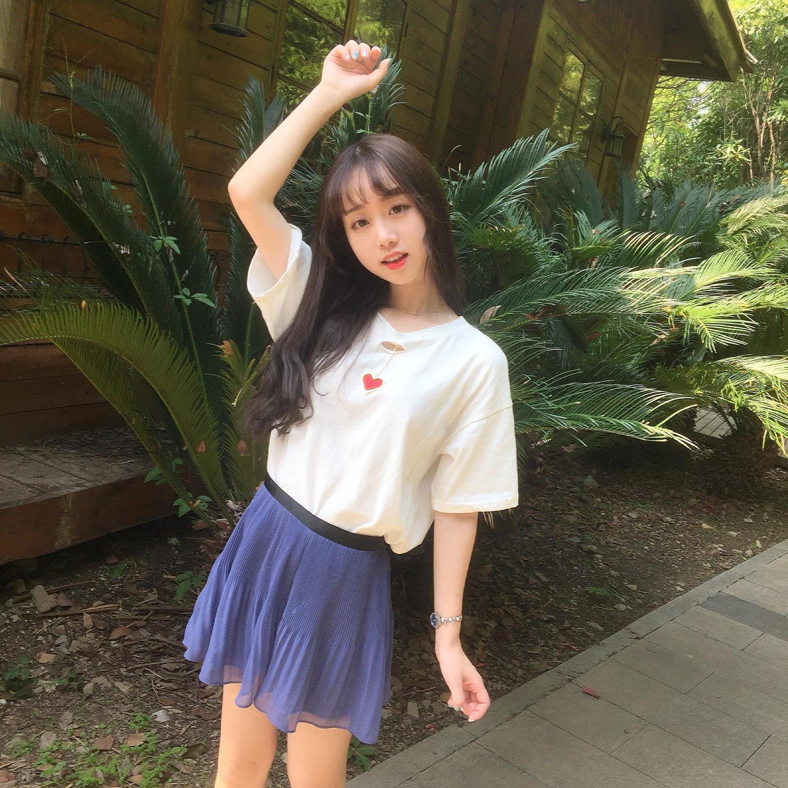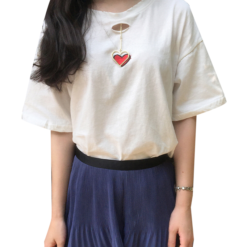 / 春夏女裝韓版軟妹可愛愛心刺繡寬松短袖T恤破洞鏤空中袖上衣學生