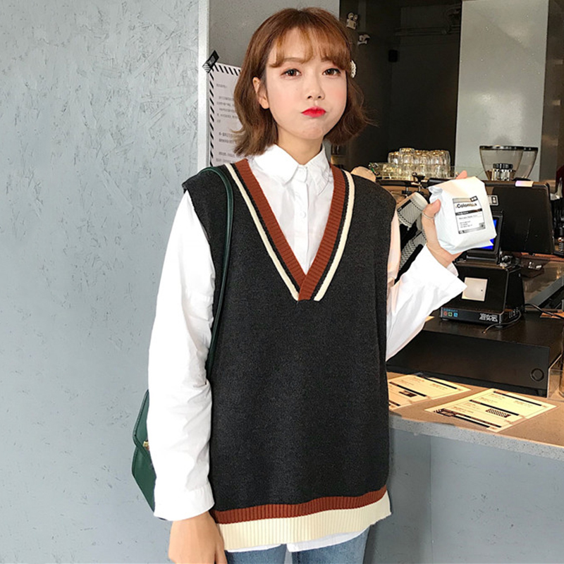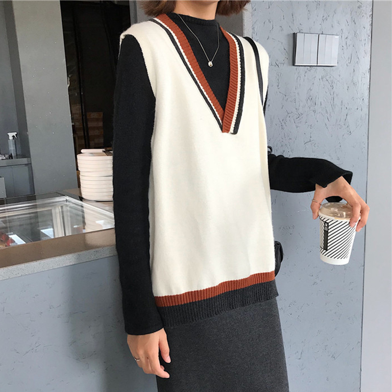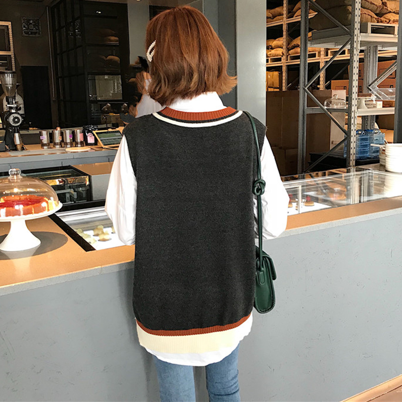 學院風針織衫馬甲女秋裝新款寬松小開叉撞色V領無袖背心上衣外套