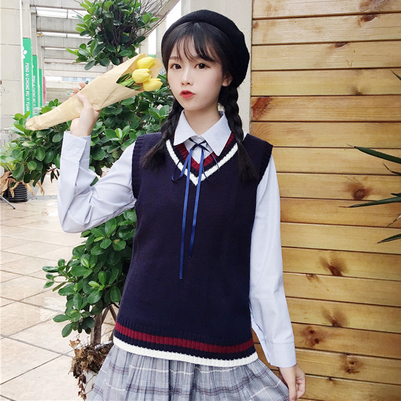 女冬裝新款韓版學生百搭條紋長袖襯衣時尚寬松V領針織馬甲兩件套