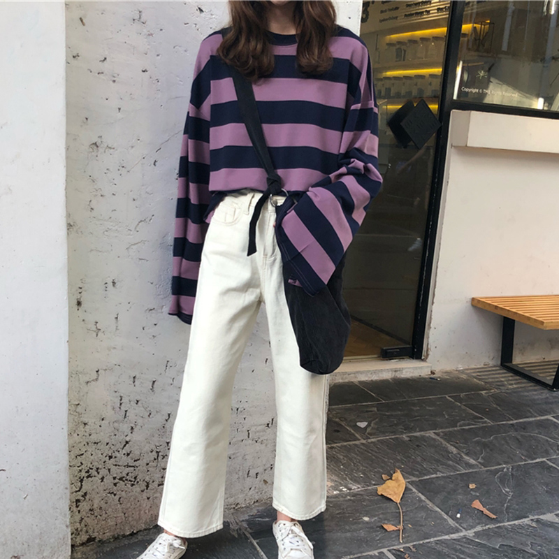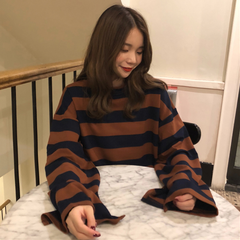 慵懶上衣秋裝女2018新款韓版寬松條紋小清新學生長袖T恤打底衫潮