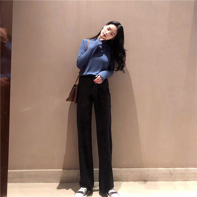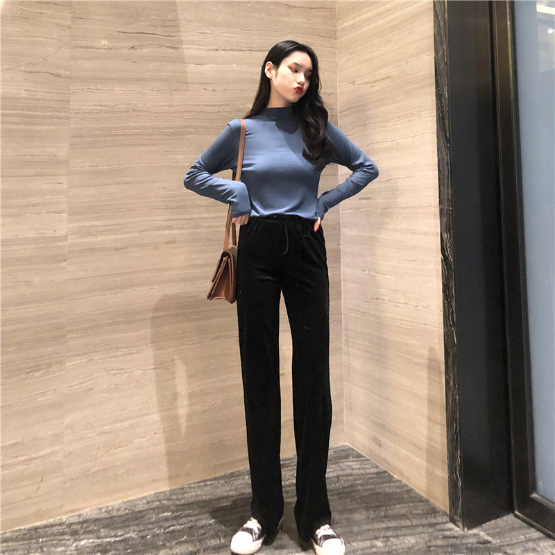 / 韓國復古風女神套裝修身顯瘦純色打底衫女+高腰直筒金絲絨闊腿褲