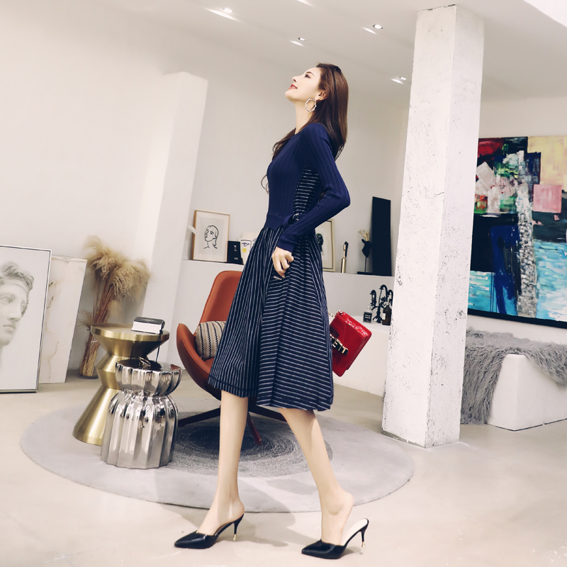 名媛2018秋季新款長袖打底裙韓版女假兩件中長款拼接針織連衣裙潮