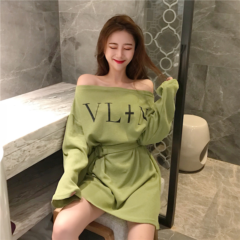 港味chic2018新款韓版一字露肩晚晚風百搭高腰綁帶寬松顯瘦連衣裙