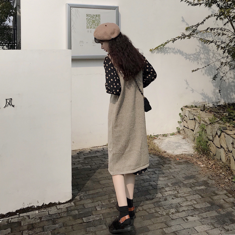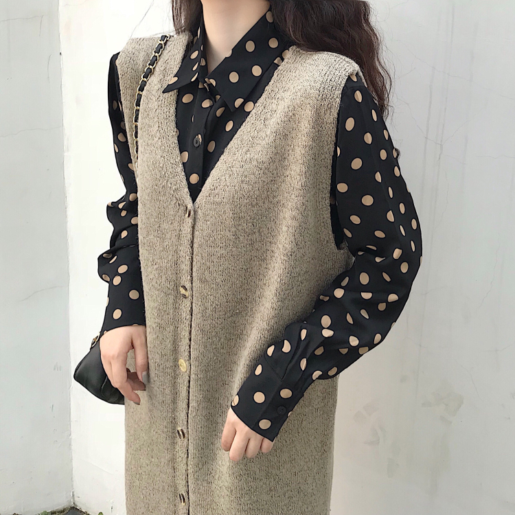 慵懶風長款兩穿針織開衫馬甲外套波點襯衣連衣裙女時尚套裝兩件套