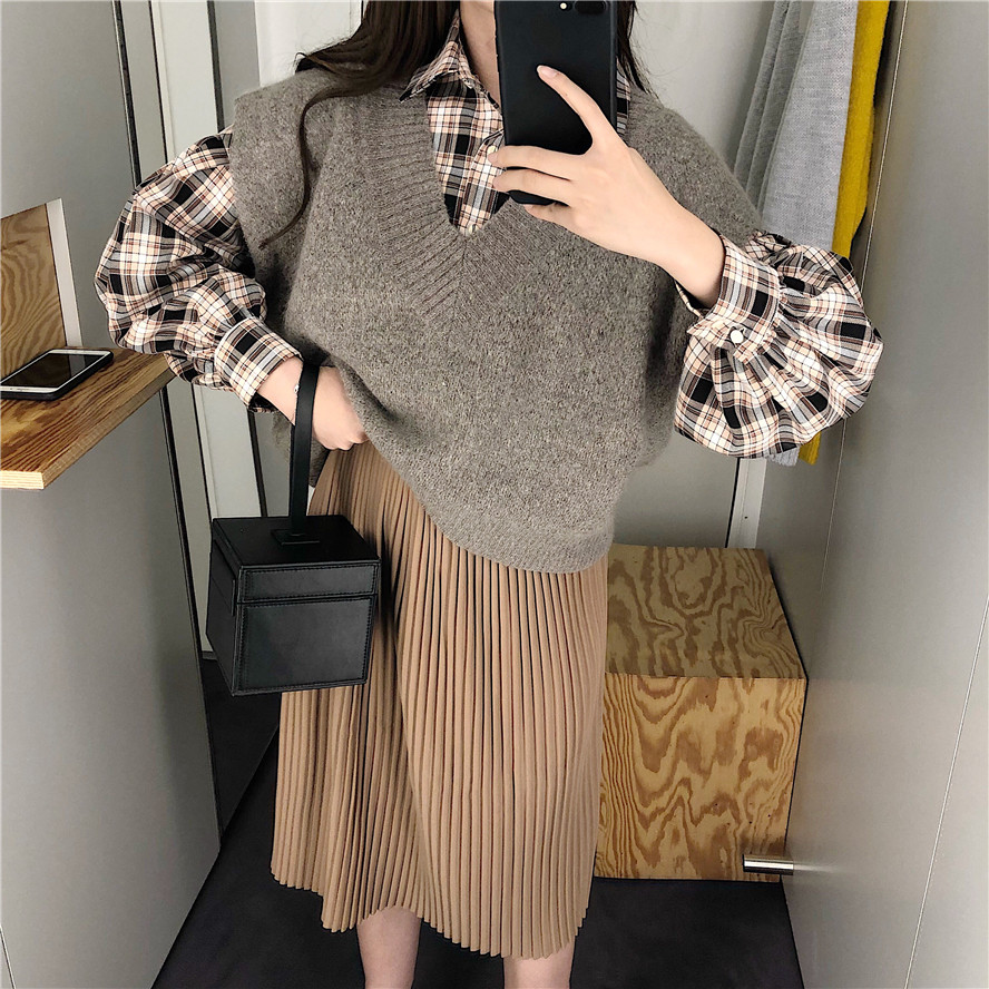 / 韓版時尚休閑套裝秋季女裝中長款格子襯衣+針織馬甲+百褶裙三件套