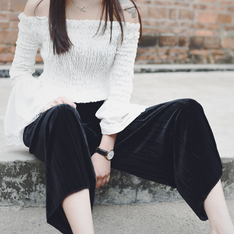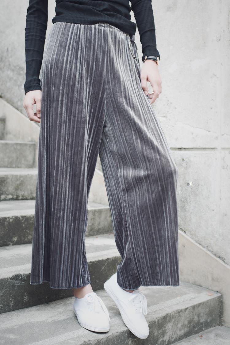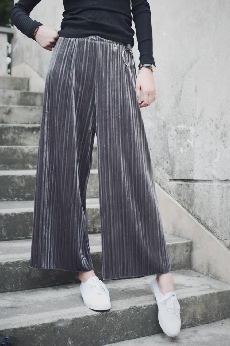 / 春夏女裝2017新款韓版百褶絲絨松緊腰闊腿褲九分寬松休閑褲直筒褲