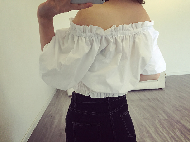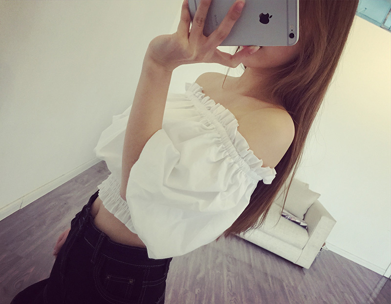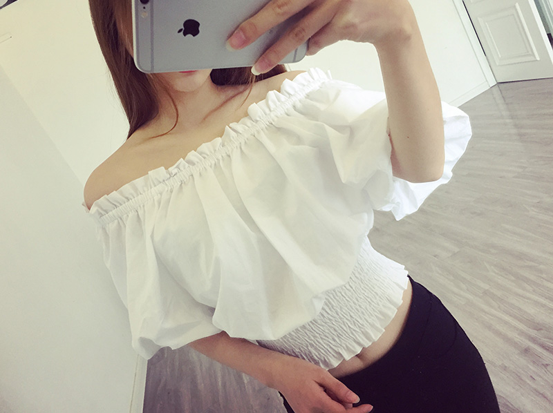 / 春夏季女裝短袖藍白豎條紋襯衫女性感甜美一字領露肩泡泡袖上衣夏
