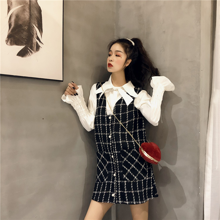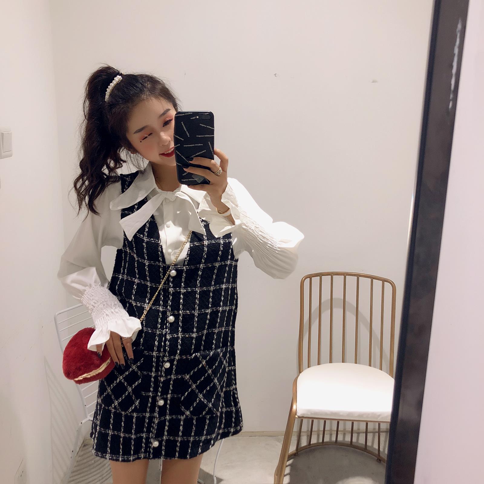 / 韓系女神套裝秋兩件套復古花苞袖系帶襯衫+小香風格子毛呢連衣裙