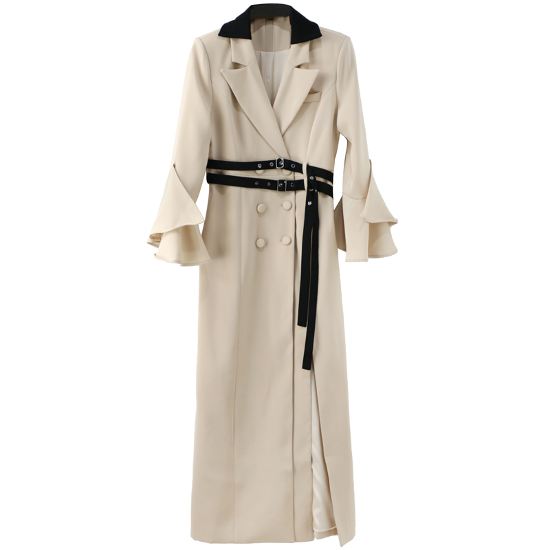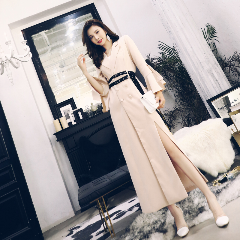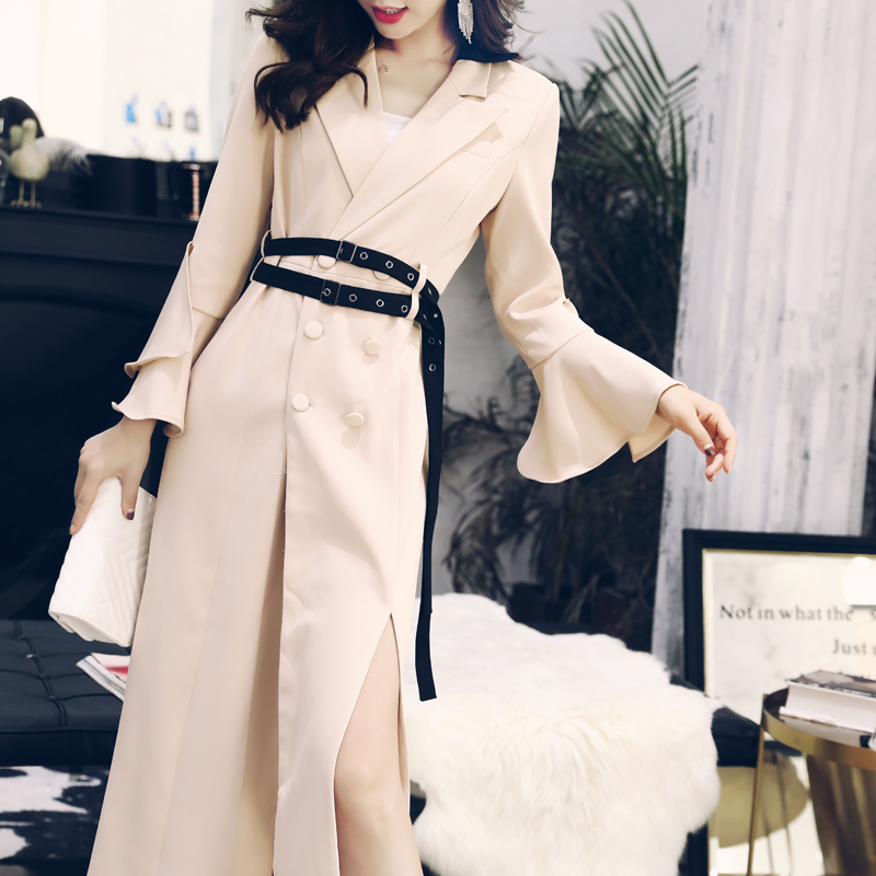 西裝風衣女中長款2018新款氣質修身顯瘦高開衩系帶收腰拉風外套女