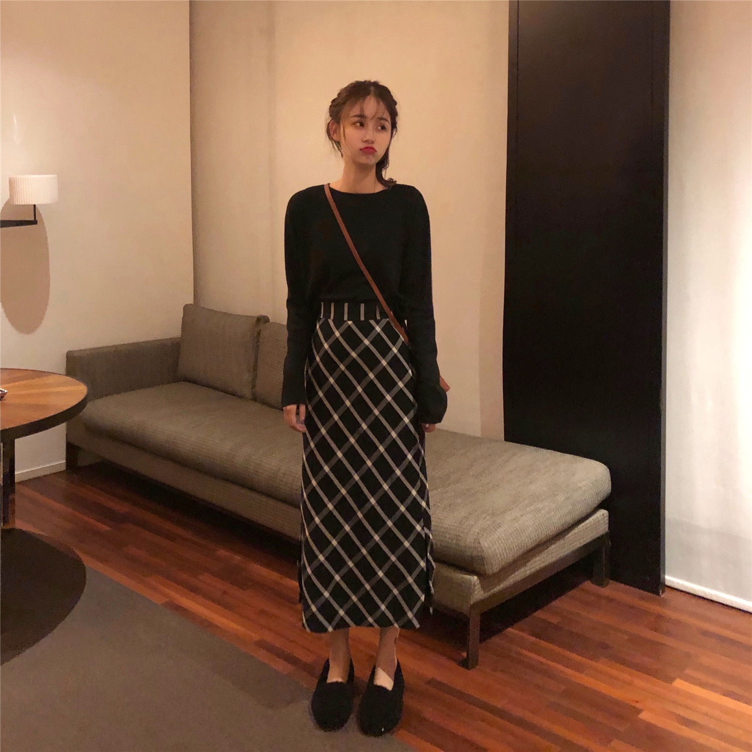 / 韓版慵懶風黑色開叉長袖針織上衣+格子百搭半身高腰A裙時尚兩件套