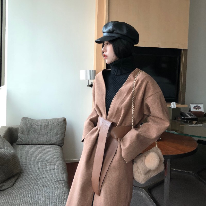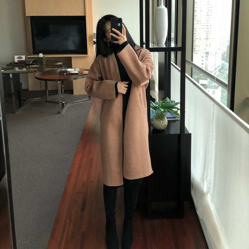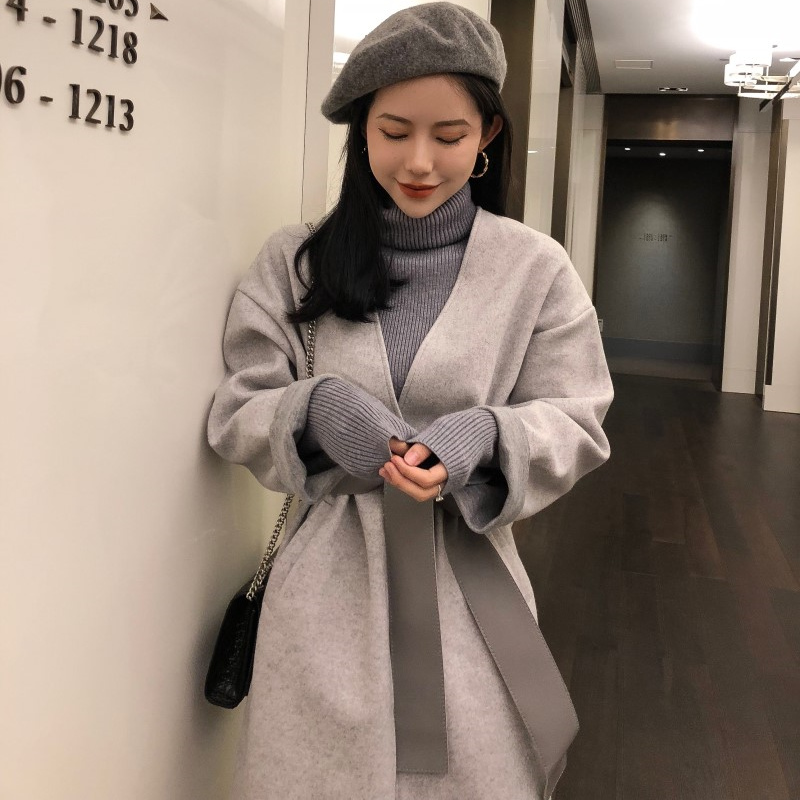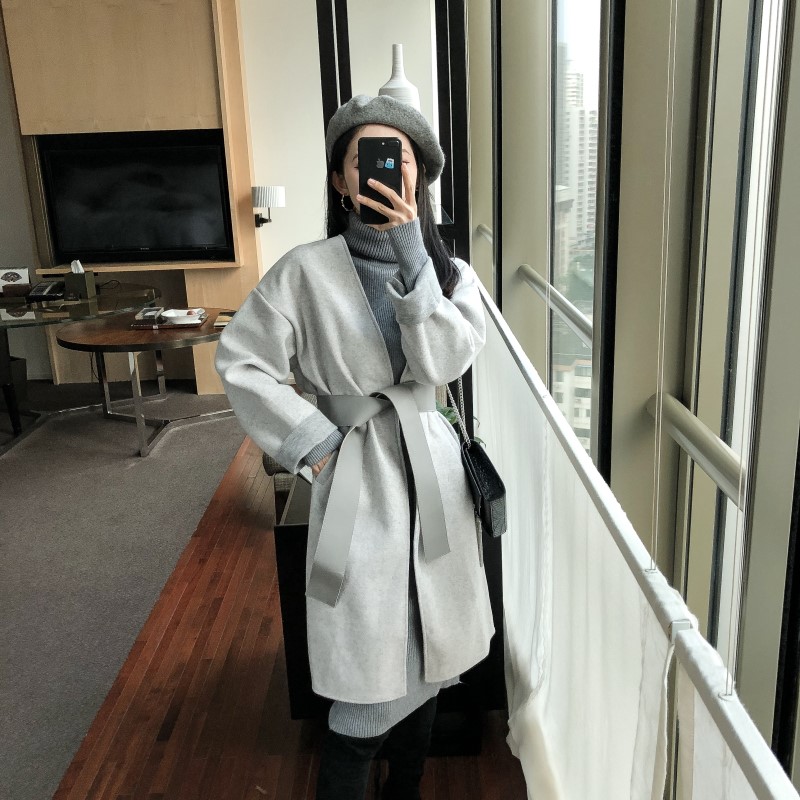 / 小香風時尚氣質chic復古氣質女百搭寬松顯瘦中長款毛呢外套配腰帶