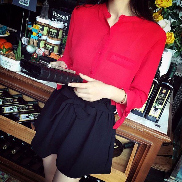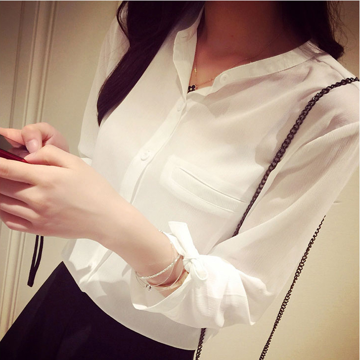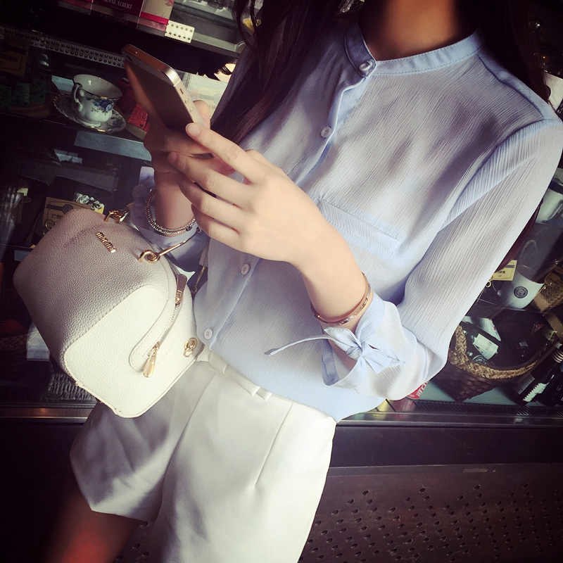 2017夏季新款春裝韓版休閑上衣白色襯衣七分袖立領雪紡襯衫女韓范