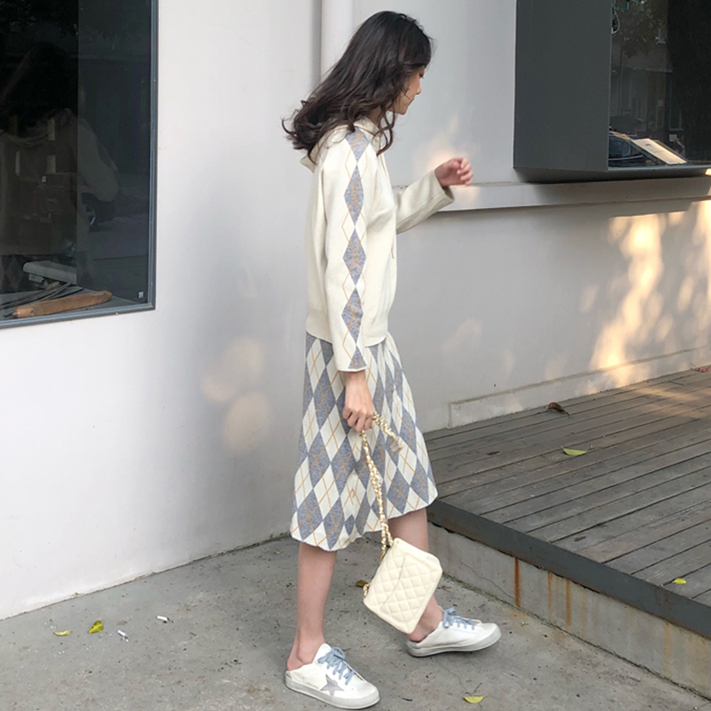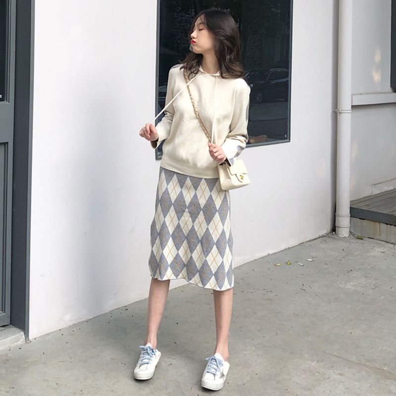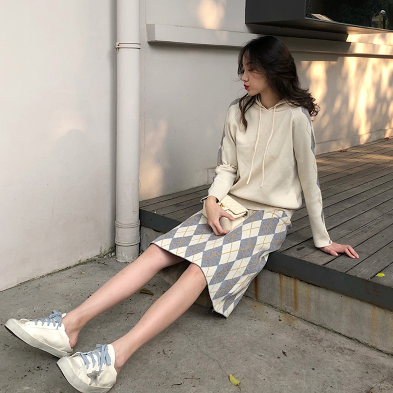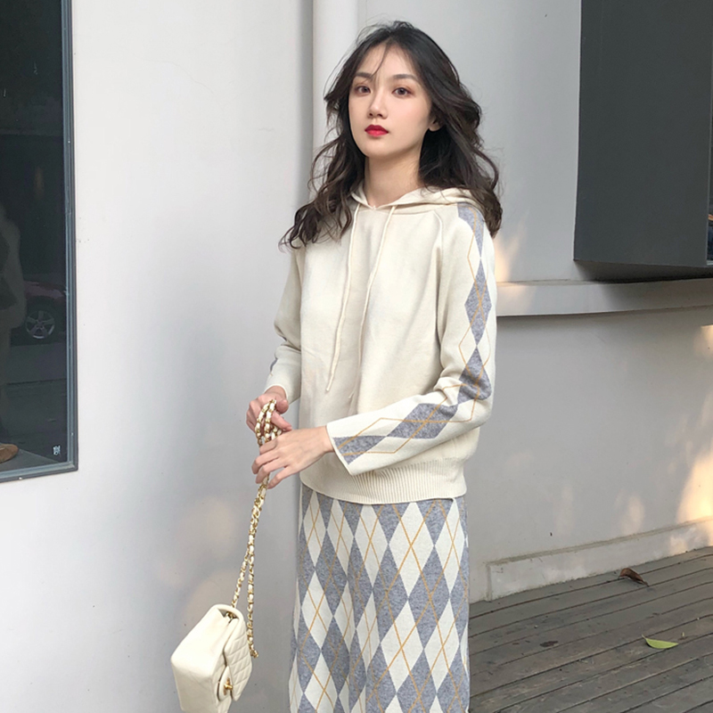 / 毛衣配裙子兩件套秋冬裝新款寬松連帽針織衫高腰顯瘦菱格半身裙子