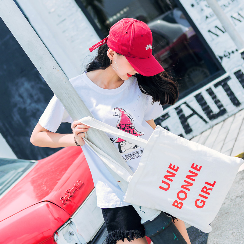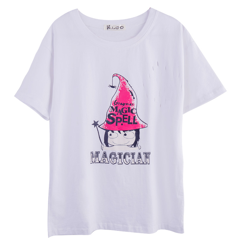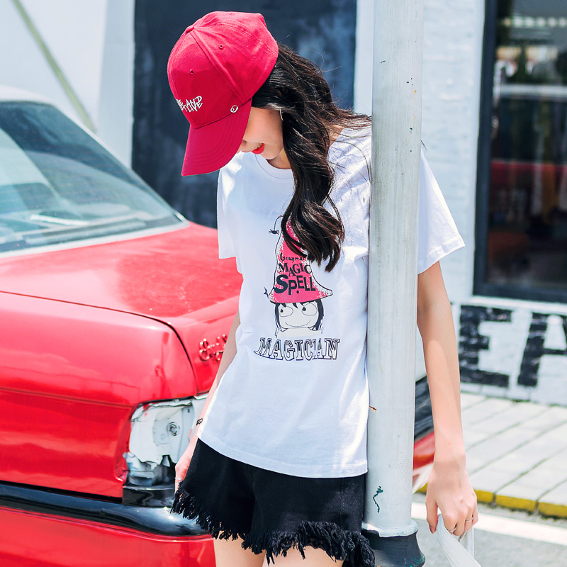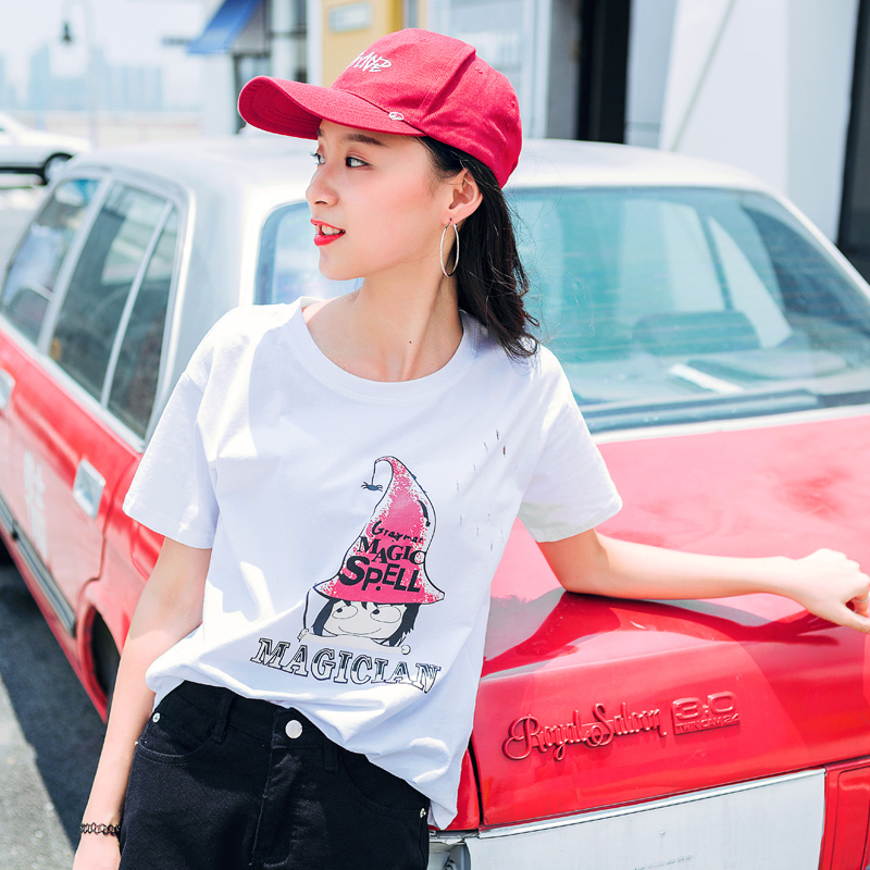 / 卡通印花學院風短袖T恤女夏季新款女裝韓版寬松百搭破洞上衣