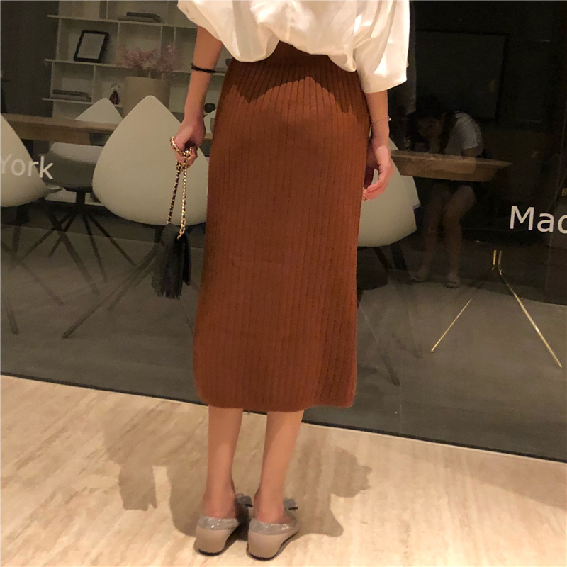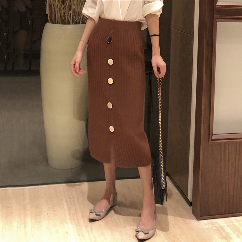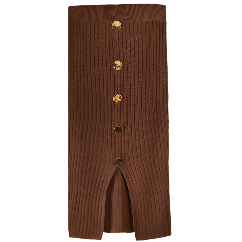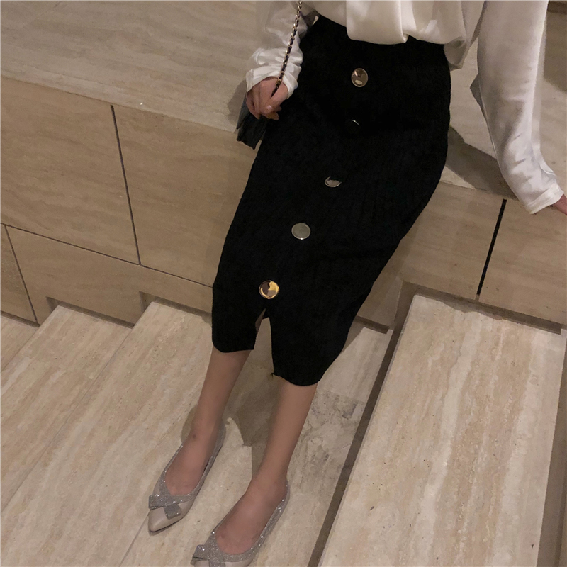 / 復古修身坑條針織半身裙秋裝女2018新款金屬紐扣開叉a字中長裙子