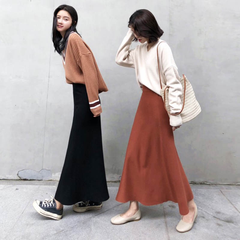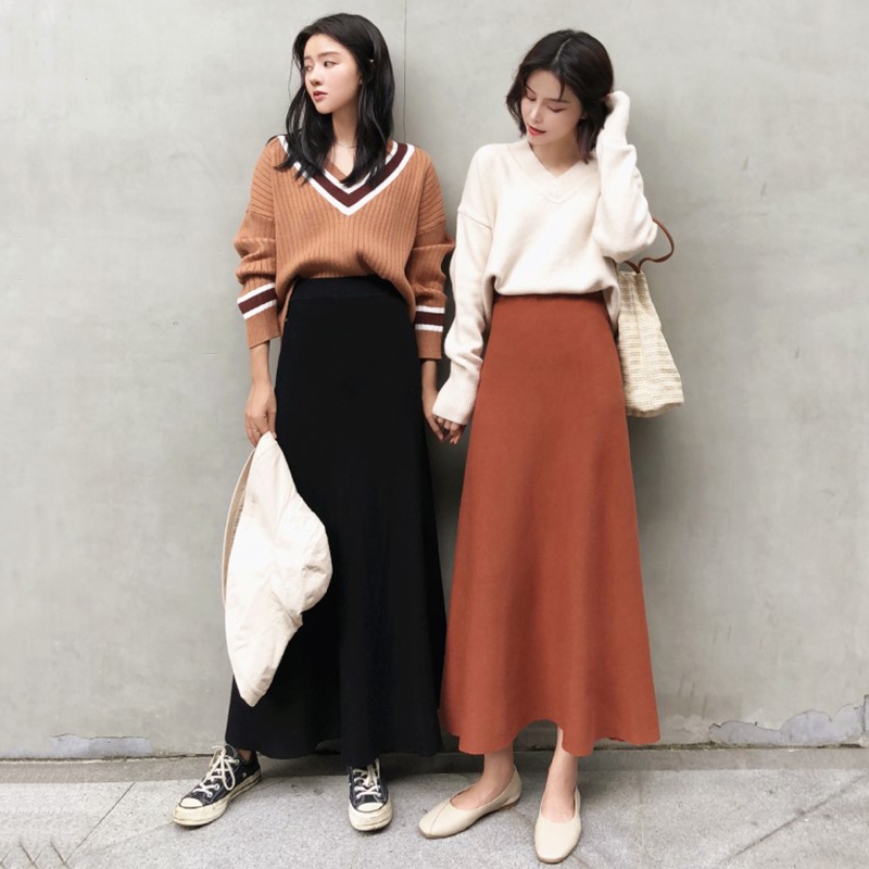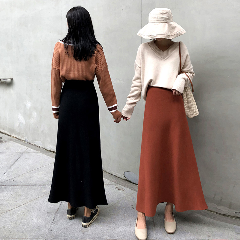 大擺A字裙秋裝女2018新款韓版高腰針織半身裙學生時尚中長黑裙子
