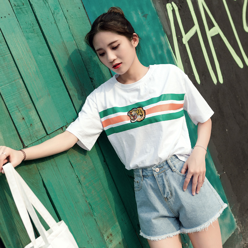 / 夏裝新款女裝上衣韓版圓領短袖條紋老虎刺繡T恤女學生體恤潮
