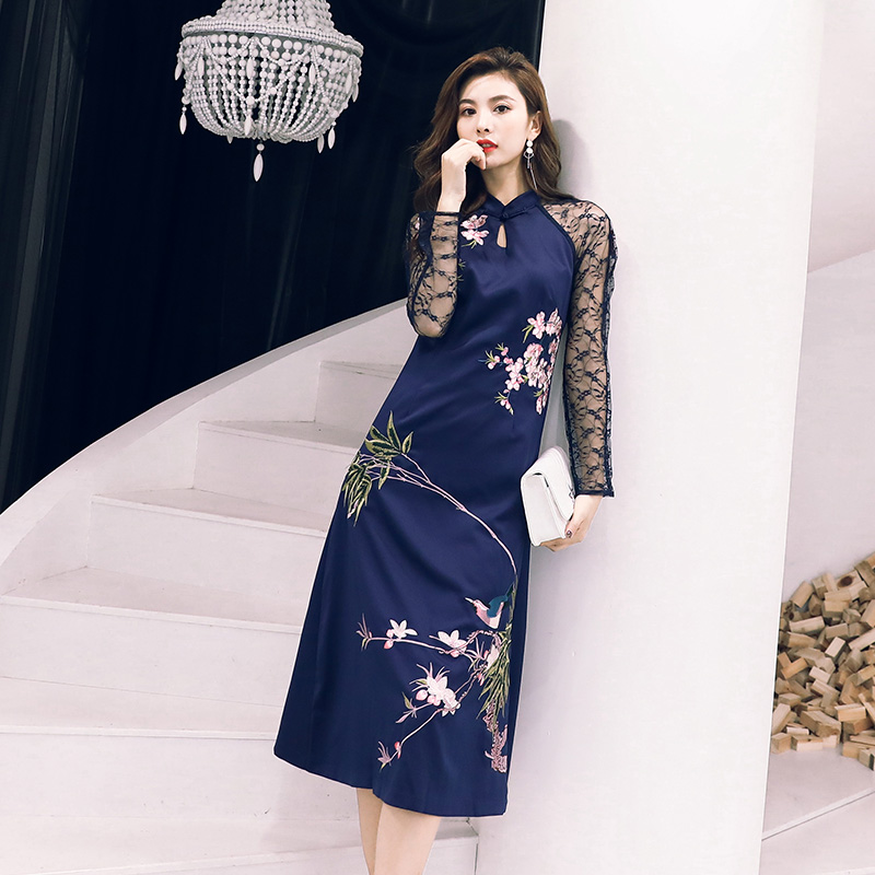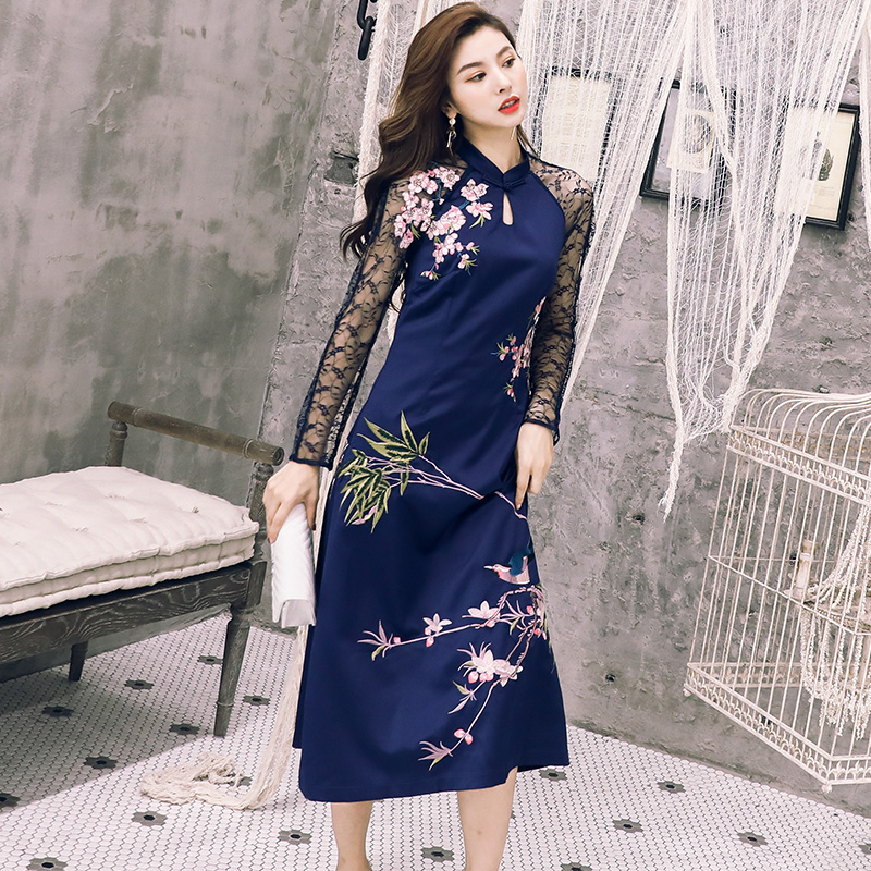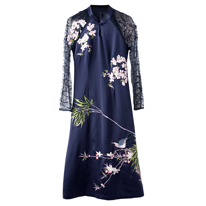 名媛氣質2018新款拼接刺繡改良版中國風復古繡花時尚旗袍連衣裙潮
