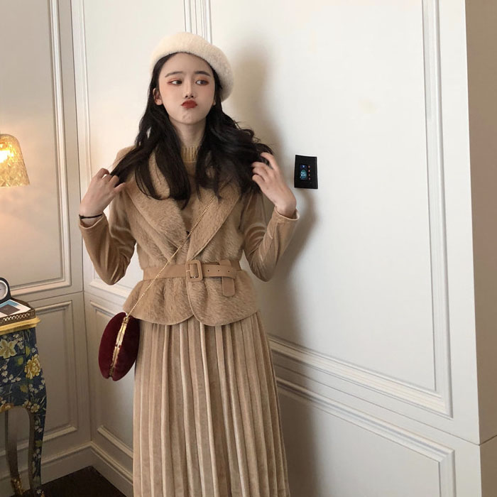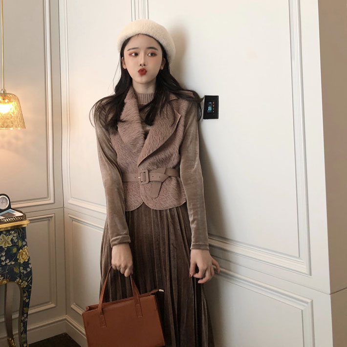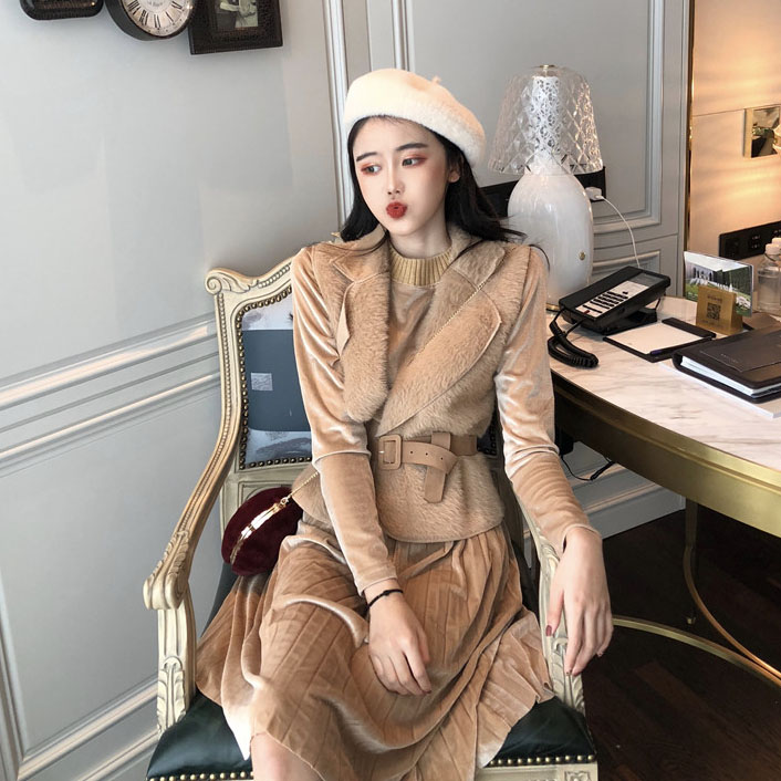 / 復古秋裝女2018新款套裝時尚壓褶收腰連衣裙女+百搭小馬甲兩件套