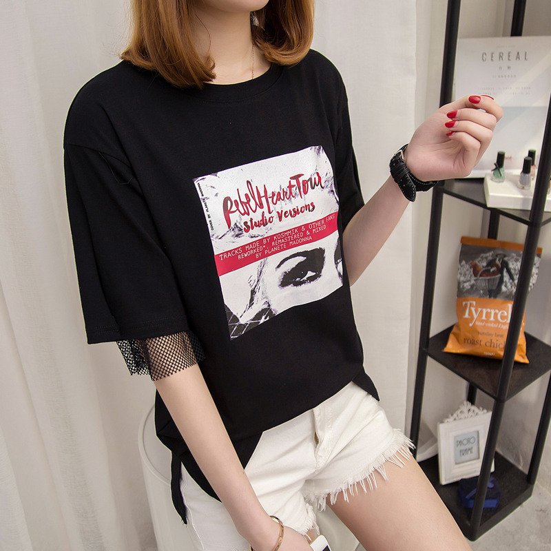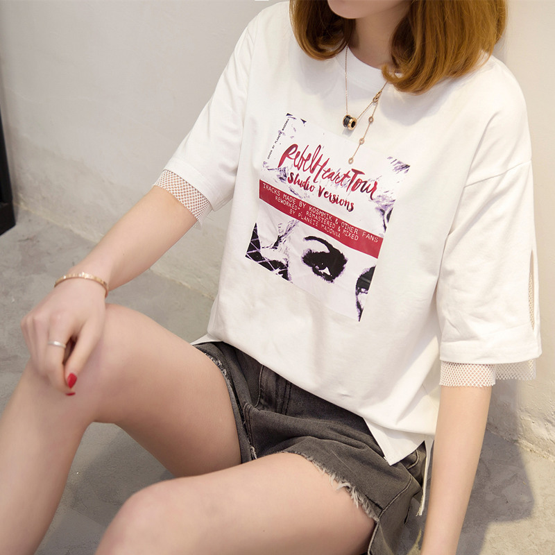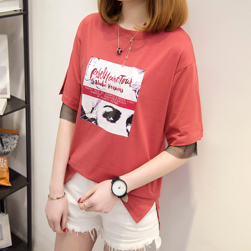 / 女裝夏裝新款潮寬松t恤女短袖網紗假兩件韓版學生中長袖百搭
