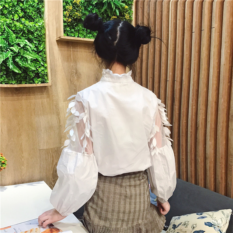 / 早秋新款女裝甜美立領網紗拼接寬松顯瘦樹葉花燈籠袖學生襯衫上衣