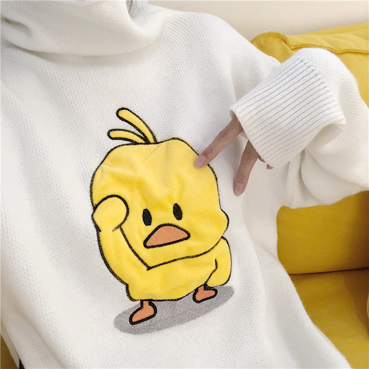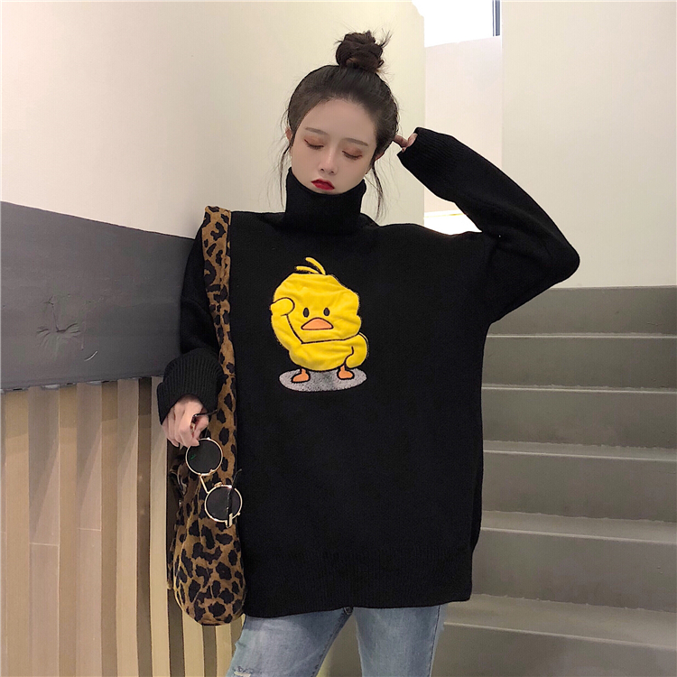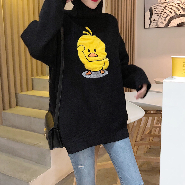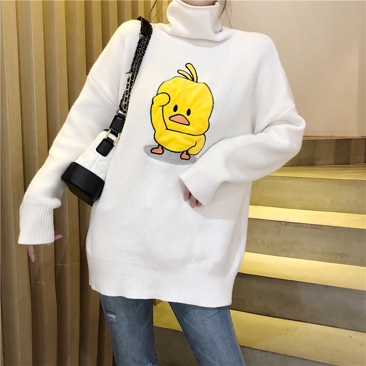 韓版小黃鴨甜美慵懶風高領毛衣女秋冬2018新款寬松中長款針織衫潮