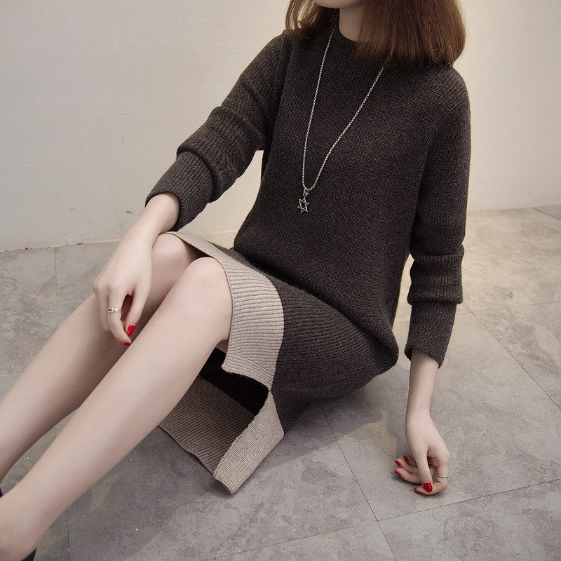 / 中長款毛衣女套頭秋冬季韓版寬松拼色加厚外套針織打底衫毛線衣潮