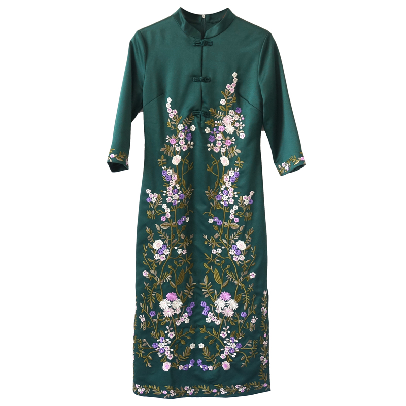 復古2018春秋季新款繡花鏤空改良款旗袍連衣裙立領七分袖鉛筆裙子