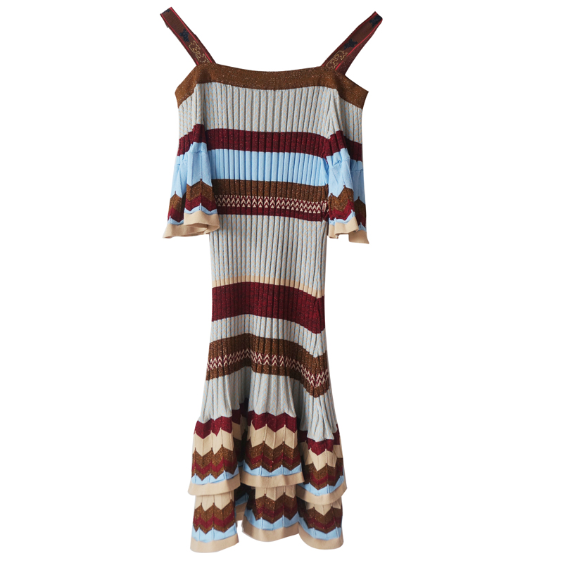 / S秀2018夏季新款一字領露肩吊帶時尚拼接連衣裙修身顯瘦鉛筆裙子