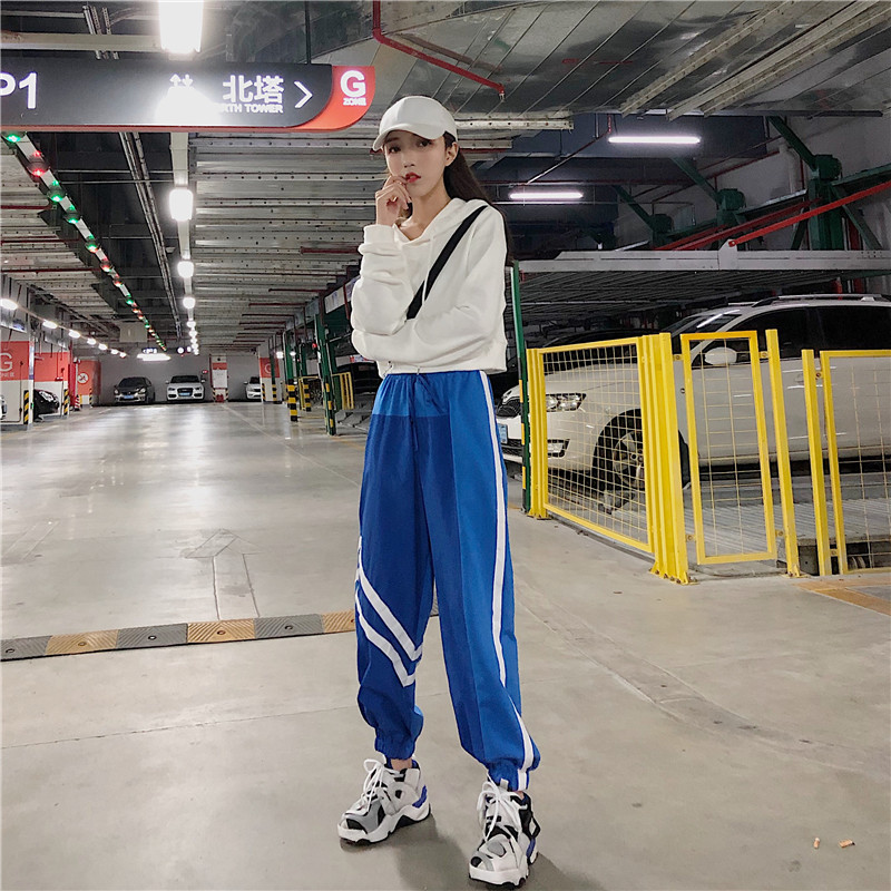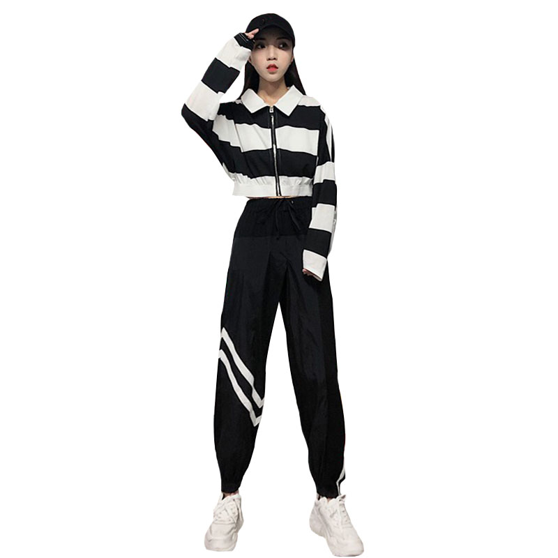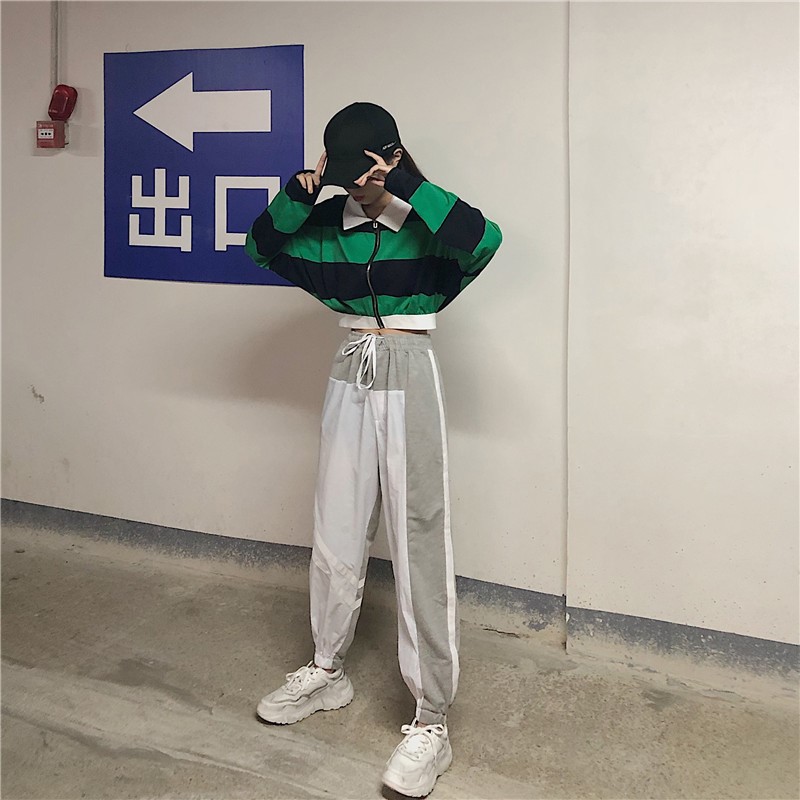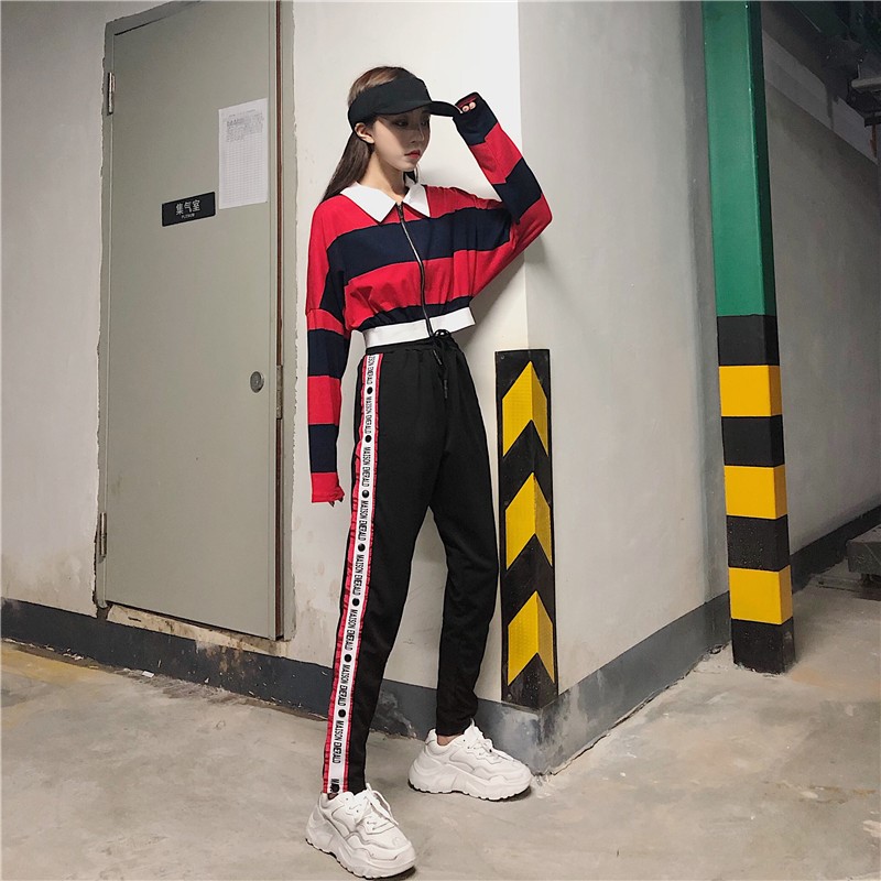 / 韓版休閑運動套裝秋季女裝條紋撞色長袖上衣+松緊腰哈倫褲兩件套