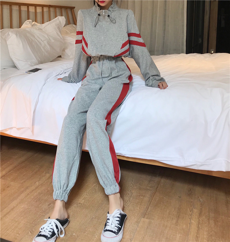 / 港味2018秋季新款時尚套裝長袖拼接上衣松緊腰休閑束腳褲兩件套女